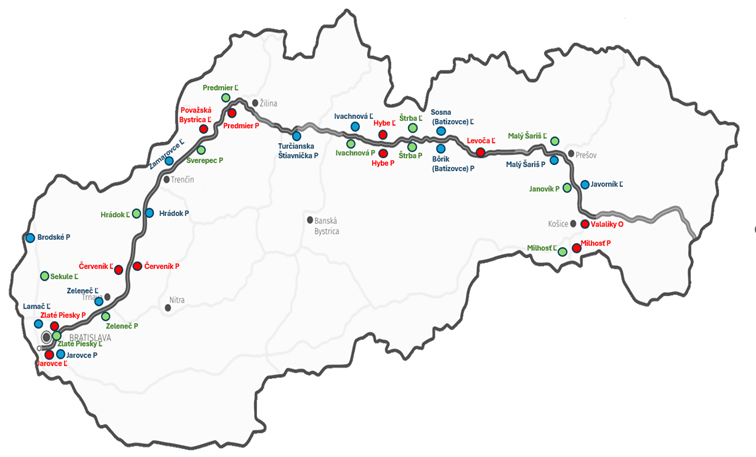 Porad.č. | Názov | Ťah | Smer | Strana | Koridor | Maximálna rezervovaná kapacita (MW) | Minimálny počet 300kW nabíjacích bodov pre osobné vozidlá | Minimálny počet 400kW nabíjacích bodov pre nákladné vozidlá | Lokalita |